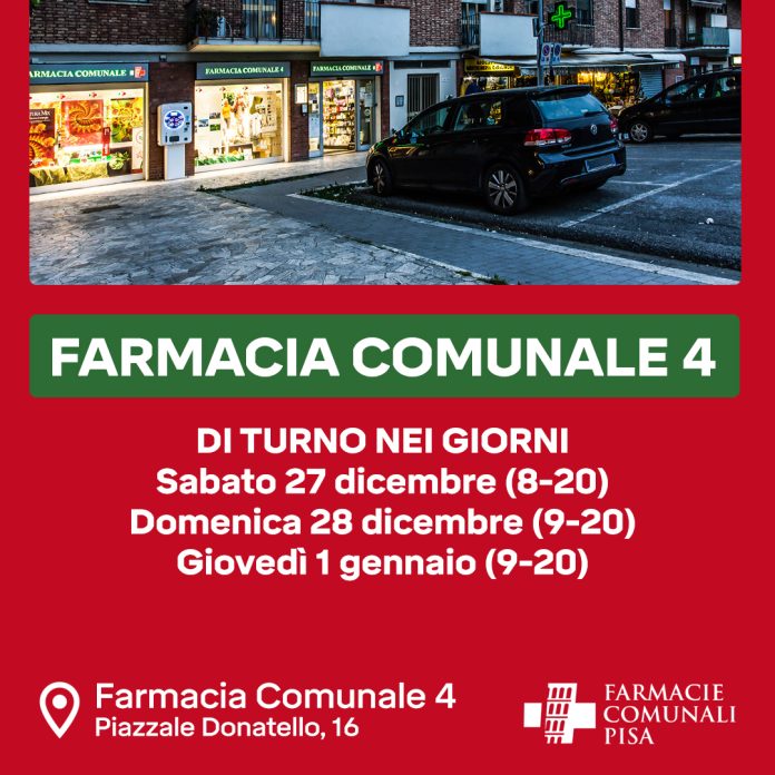 La Farmacia Comunale 2 di XXIV Maggio, 63 sarà di turno il fine settimana del 27 e 28 dicembre e giovedì 1 gennaio 2026.